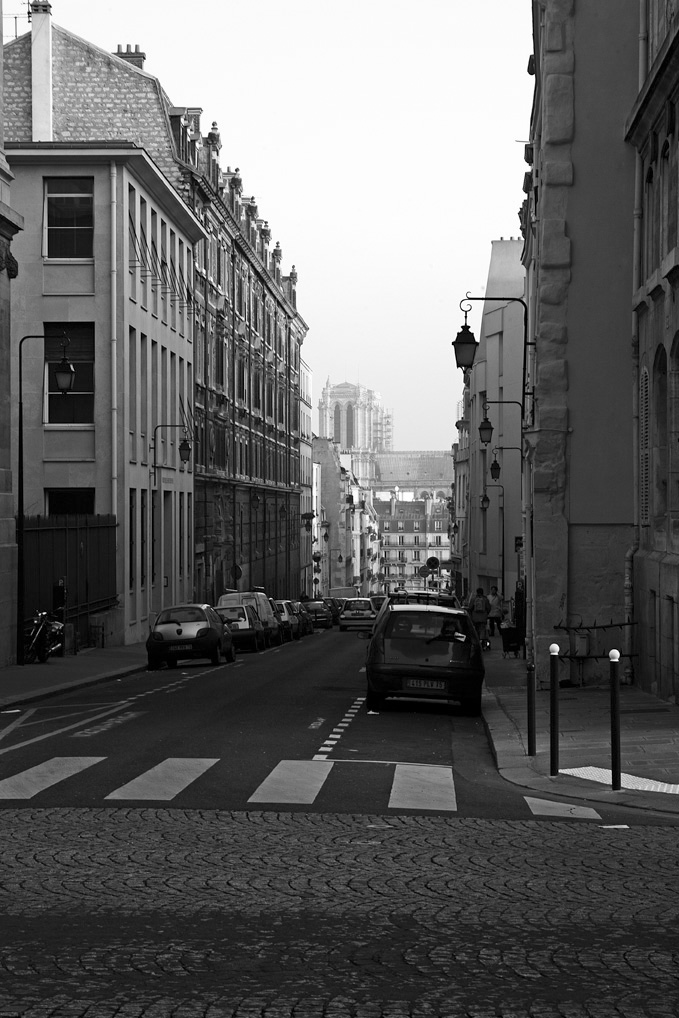パンテオンを背にスフォー通りを下ると直ぐ右に Vallette通りに繋がる、Carmes通りがある。 坂を下るとその先にセーヌがあることは、先に見えるノートルダムの鐘楼があることで判る。