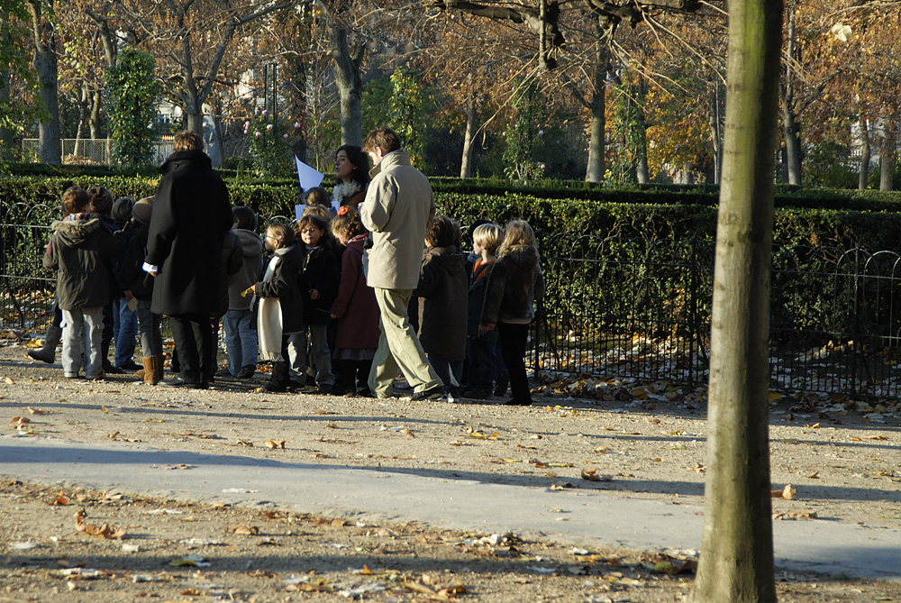 リュクサンブール公園にて 人形劇か紙芝居かは判らないが、100年以上まえ(アジェの写真より)から子供たちの遠足の場でもあった。