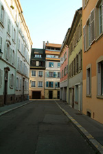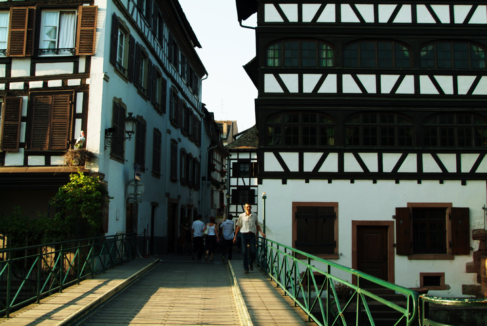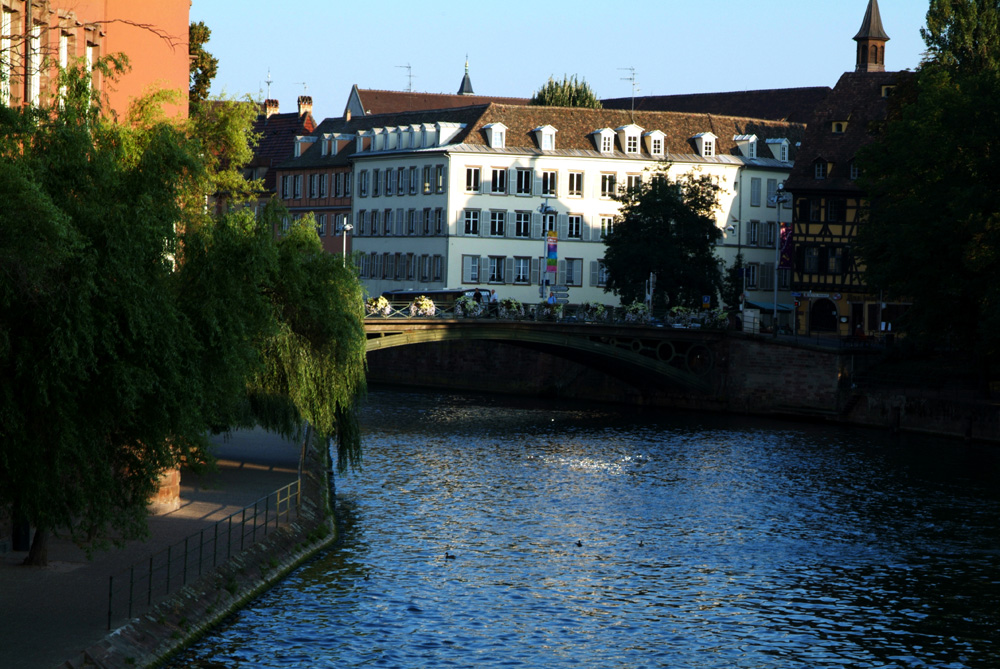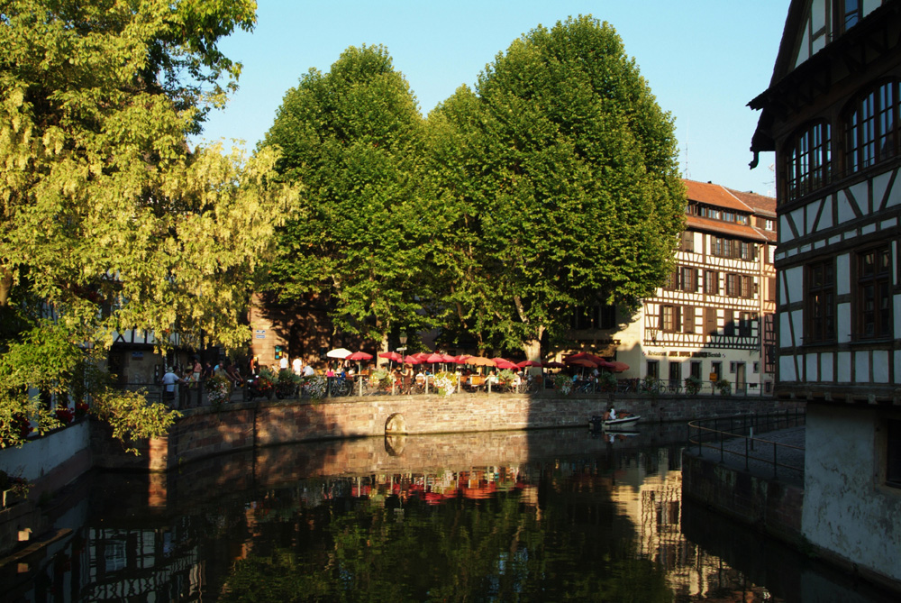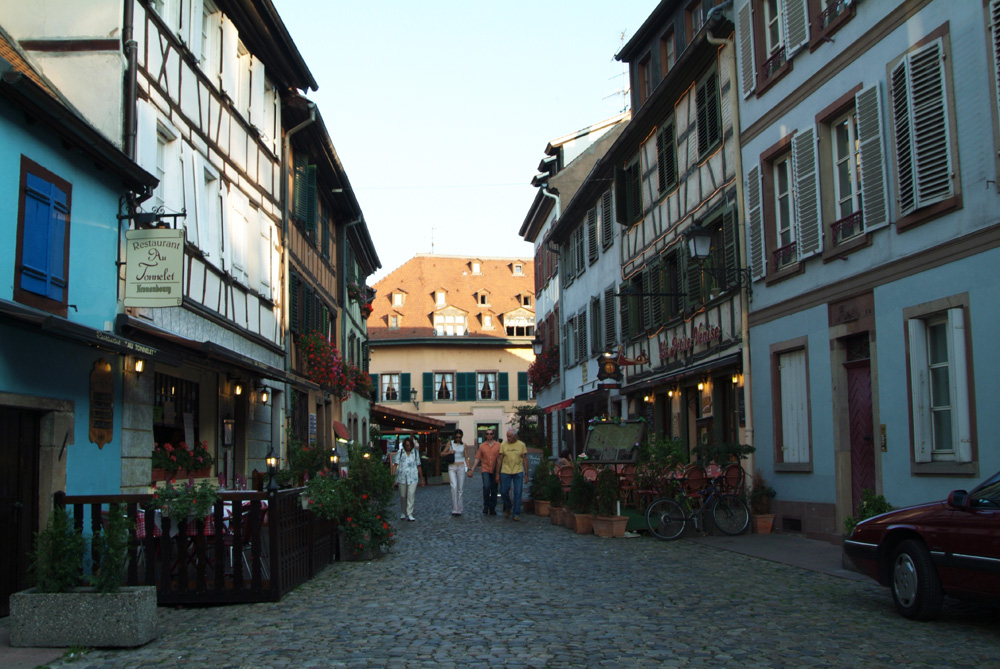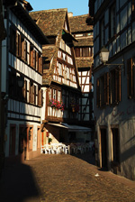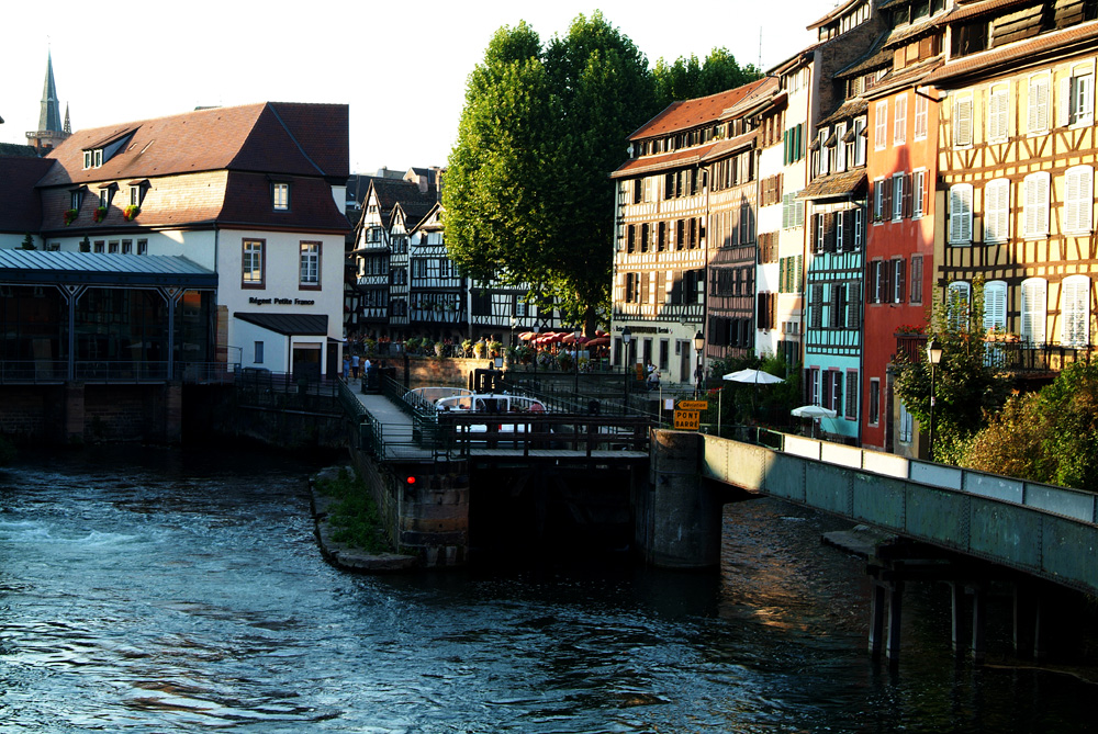 フランス アルザス地方の中心都市。 名から正に「道の街」。バーゼルからライン川東では、フライブルグ、西側にストラスブール」と両方とも交通の要所でもあった。 この街にはイル川が湾曲しながら流れる箇所に運河と川との中ノ島が旧市街として栄えた。現在その旧市街は、世界遺産にも登録されている。また、グーテンベルグが印刷術を発明したと都市としても有名である。 大聖堂は、ゴシックの代表的な建築物のひとつフライブルグ、バーゼルと同じ石を使用しているようで、赤い。 西向きの正門は特に夕日に映える。