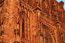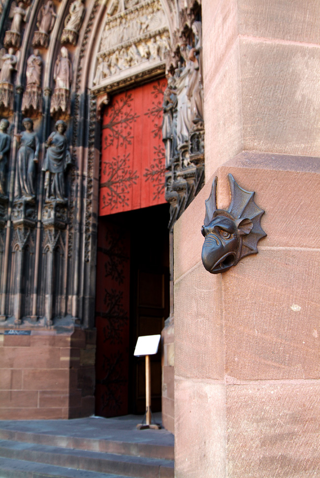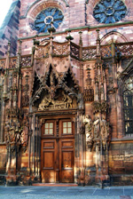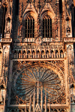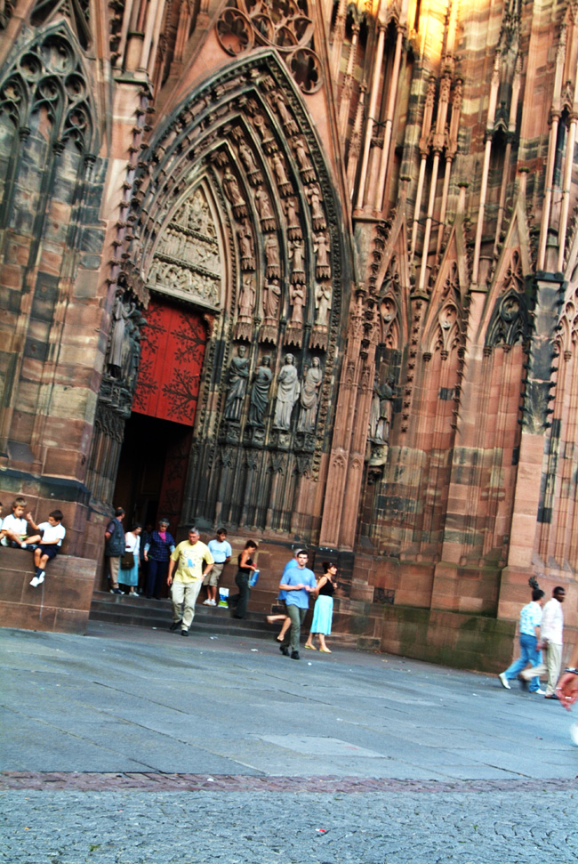 グーテンベルグ像のある広場から、大聖堂西正門に向かう。 狭い参道ような道の突き当たりにその荘厳な様相を見ると圧倒される。いつ見ても夕日の当たる聖堂は美しい。ストラスブール大聖堂も同じ。 土着信仰を持っていた現北フランス・ドイツ地域のキリスト教化への推進役としてゴシック様式の聖堂の果たした役割は大きいが、この夕日には映える 西正門、高い鐘楼を見ると、その宣教効果は現在までも我々を含んだ観光客にも放ち続けている。
