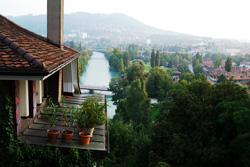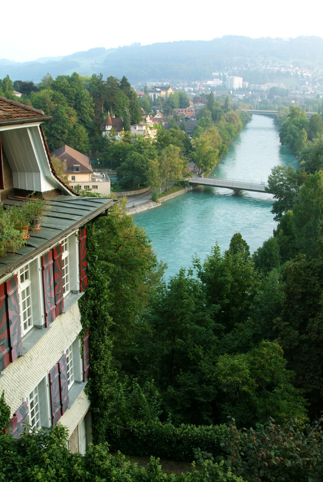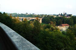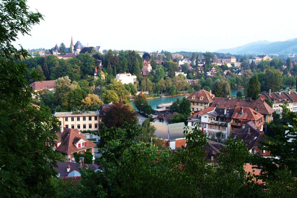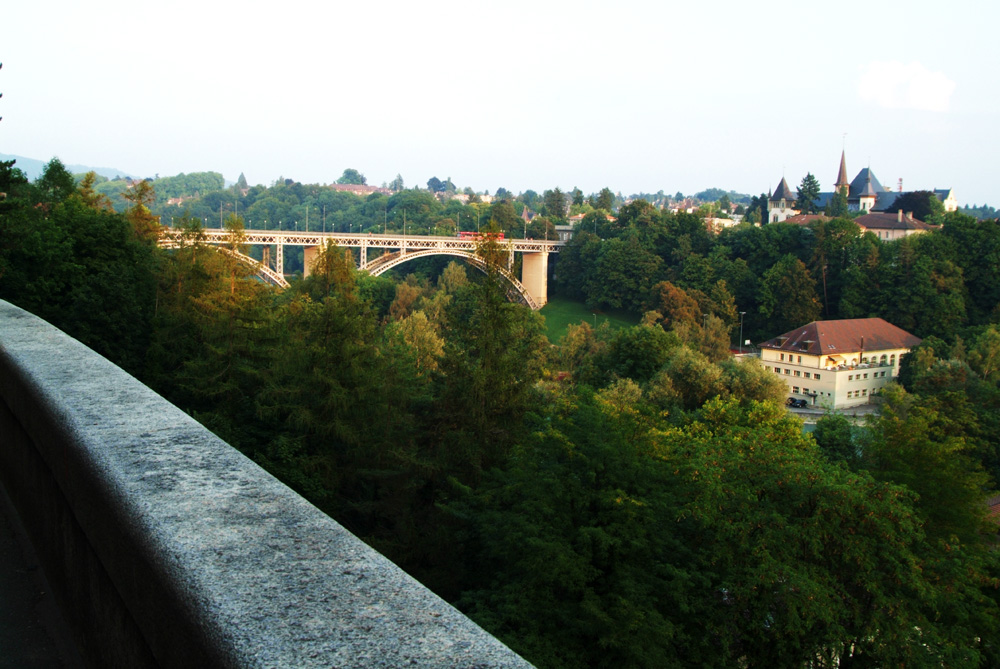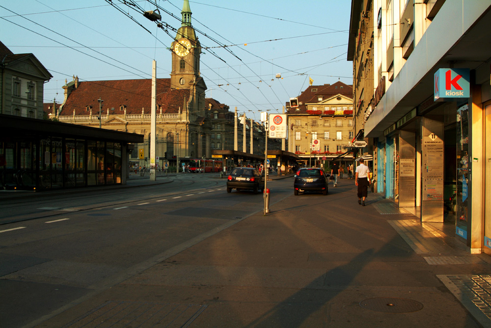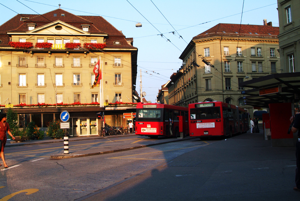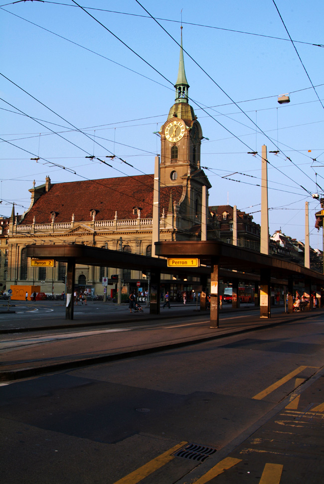ベルン中央駅より、国会議事堂の展望台へ チューリッヒから夕刻ベルン駅裏側に着き、その近くの滞在ホテルより、散策に出る。 中央駅広場方面へ行き、右折して国会議事堂方面に向かう。議事堂裏側はアーレ川の走る低地にある旧市街の展望台で、 これに添って歩き、カジノプラッツ方面に向かう。