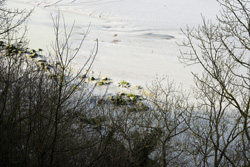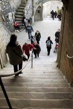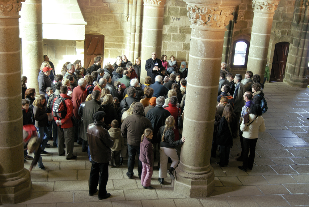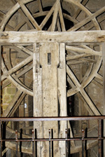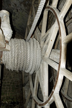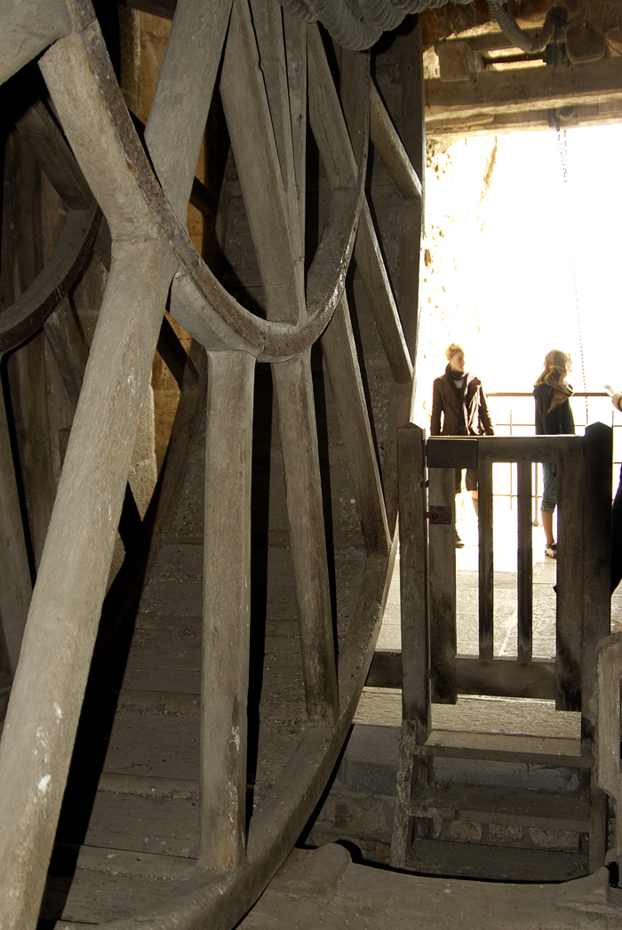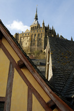趣味ではないが今までヨーロッパの教会は随分と多く見てきたが、事前知識の通り、ここモンサンミッシェルは違う。先に島の評価を江ノ島と例えて顰蹙 をかっているいると思うが、むしろ比叡山だ。中心となる聖堂は、聖職者全体或いは巡礼者を併せた全体の礼拝に使うのであろうけれど、他にいくつもの 小さな礼拝堂がある。しかもその数が多い。歴代の司教、或いは聖人と称えられた聖職者達の名を冠した礼拝堂が続く。途中に場内の入り口から一気に 荷物を引き揚げるハムスターの運動用に見られるののと同じ人力回転滑車もあるが、その礼拝堂の多さには飽きる程であった。軽んじる積もりは全くなく、 このMSMの歴史はこういう小部屋の数即ち聖人となって聖職者の数で示されるのであろう。バチカンは行ったことがないがきっとこの究極の姿があるので あろう。参道を逆戻りするような感じで、城壁の門をくぐりその隣にある「オムレツ」で有名な宿泊先であるホテルに戻る。
