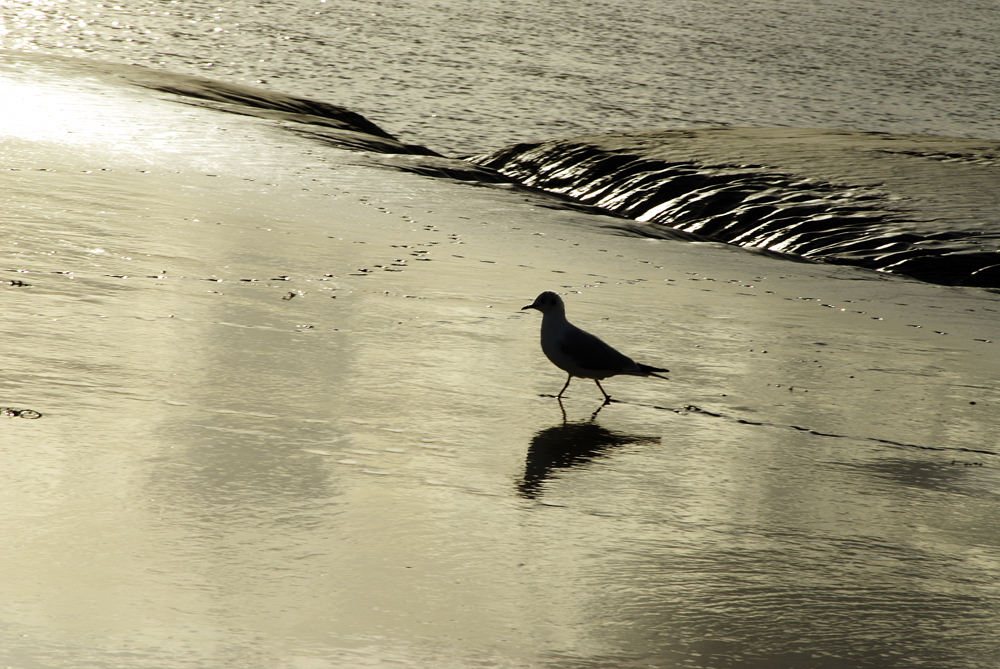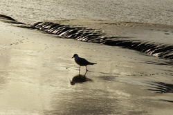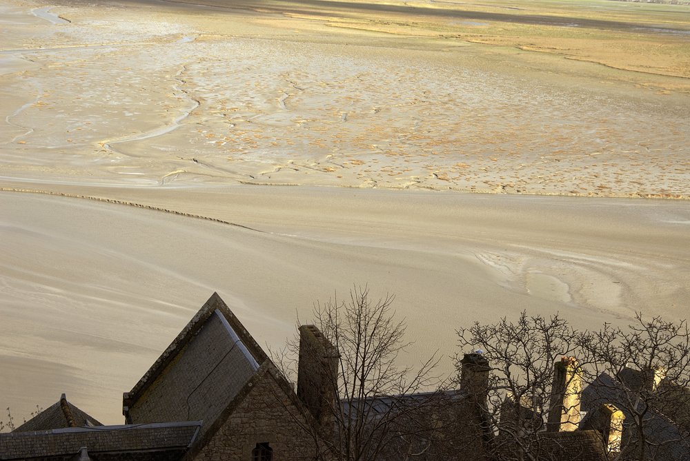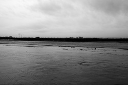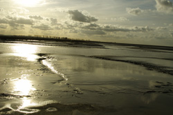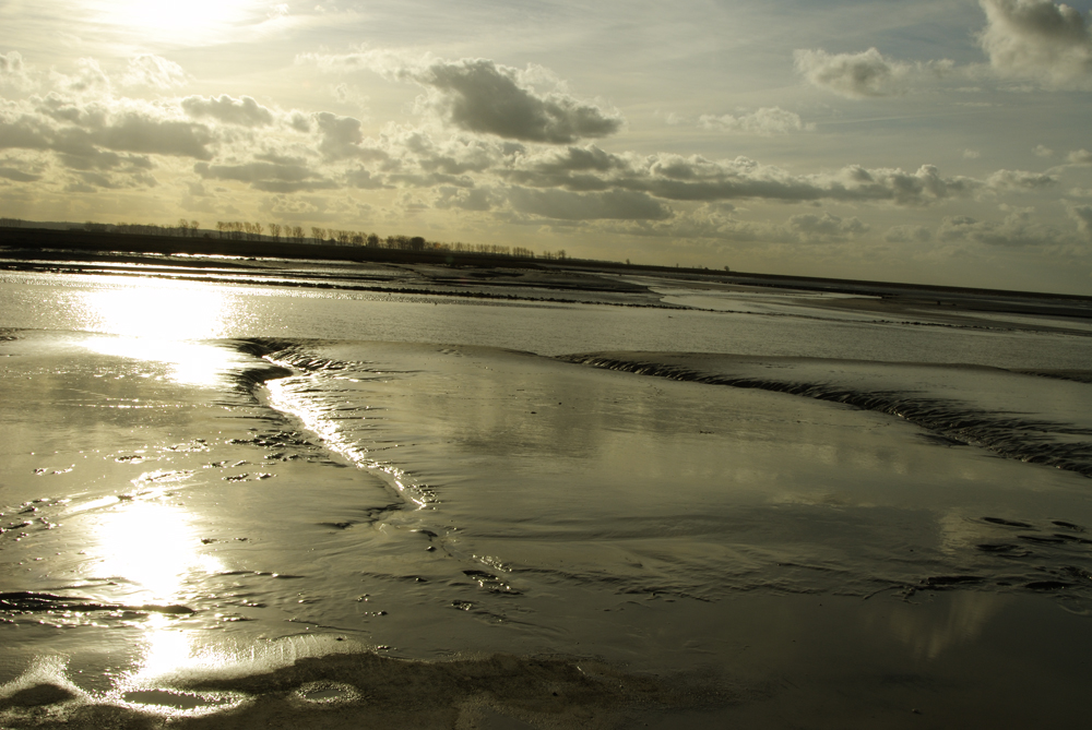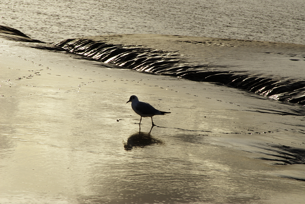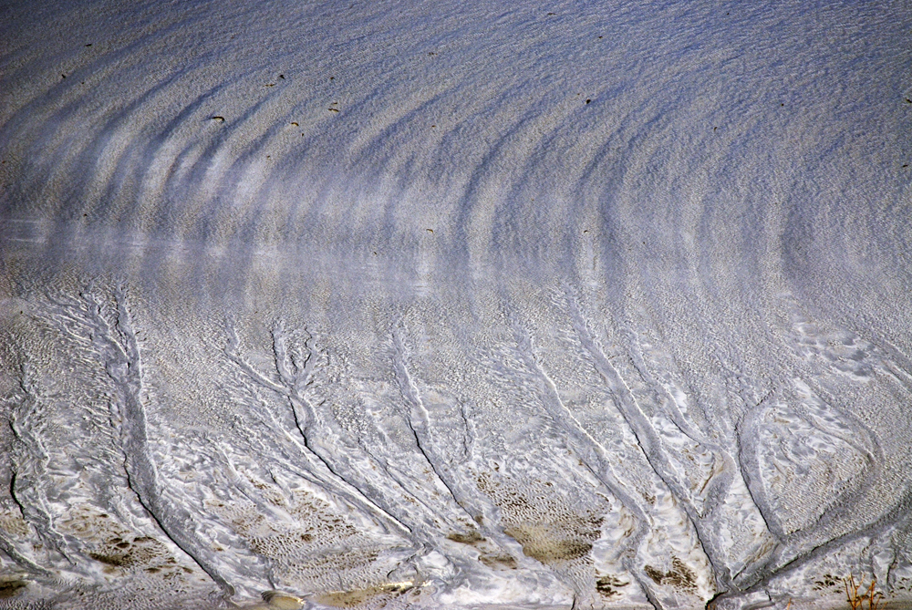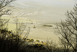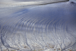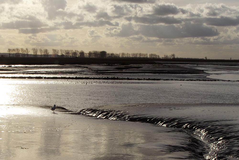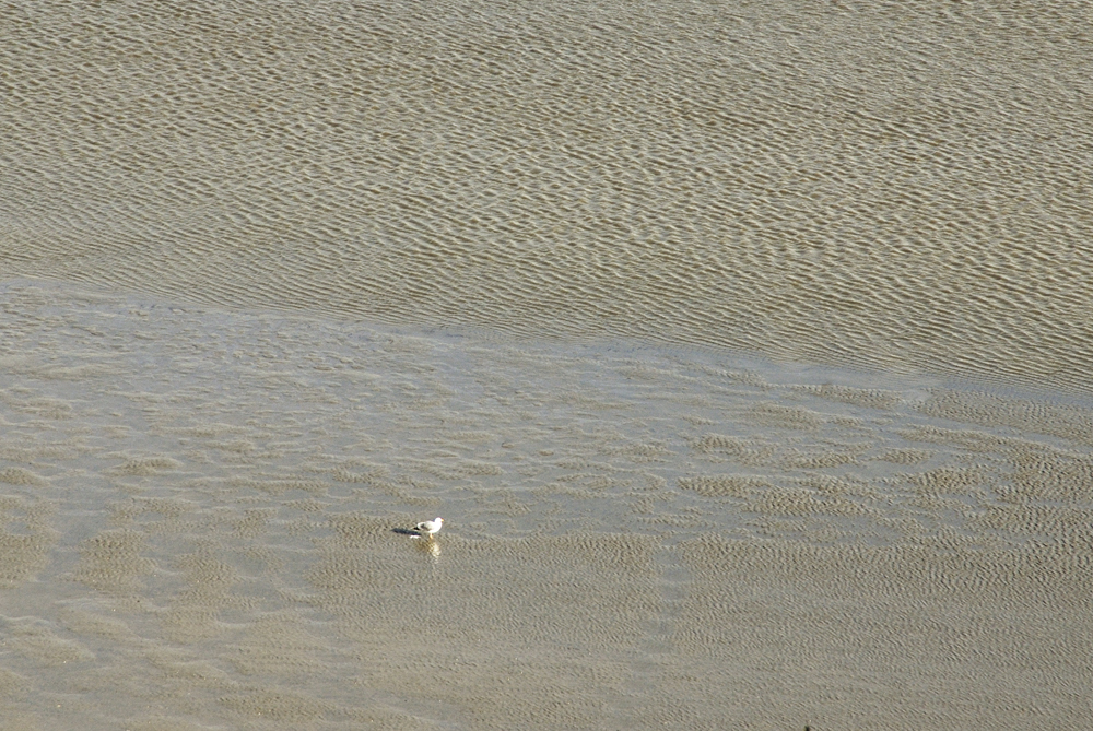 動きの速い潮によって異なる文様を作り出す。干潟に集まる鳥類、潮の流れが早く、引き潮の時に取り残される魚達も多い